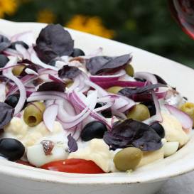- Tiem virsū liek 4 daļās sagrieztas olas, pārlaista atlikto pesto.
