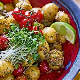 - Ceturto daļu pesto atliek, pārējo kopā ar gabaliņos sagrieztiem kaltētiem tomātiem liek pie kartupeļiem, labi sajauc.