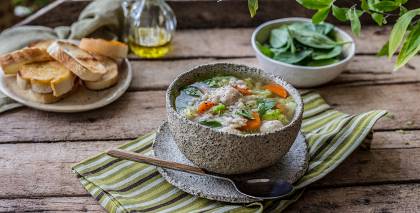 - Tad pievieno garšvielas, ar spiedi izspiestas ķiploka daiviņas, buljonu, ūdeni un miežu putraimus.