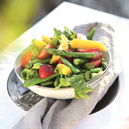 - Redīsus sagriež ripiņās, zemenes pārgriež uz pusēm vai vairākās daļās, liek kopējā traukā ar rukolu, spinātiem, mellenēm un mocarellas bumbiņām, uzmanīgi izcilā.