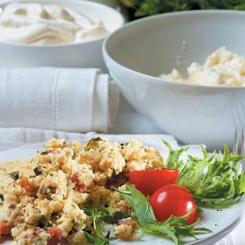 - Kvinoju ar piedevām sadala 2 bļodiņās, virsū liek nolobītas, uz pusēm pārgrieztas vārītās olas un sagrieztu avokado, pārkaisa sāli un piparus.