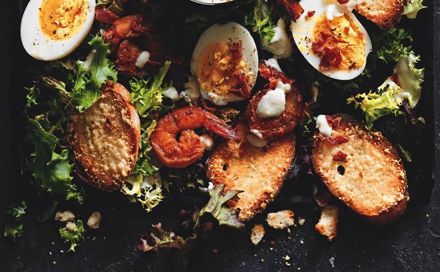 - Lēzenā traukā kārto salātlapas ar grauzdētajām bagetes šķēlītēm, uz pusēm pārgrieztām olām un garnelēm, pārber sakapāto bekonu, pārlaista pagatavoto mērci. Pārējo mērci pasniedz blakus.