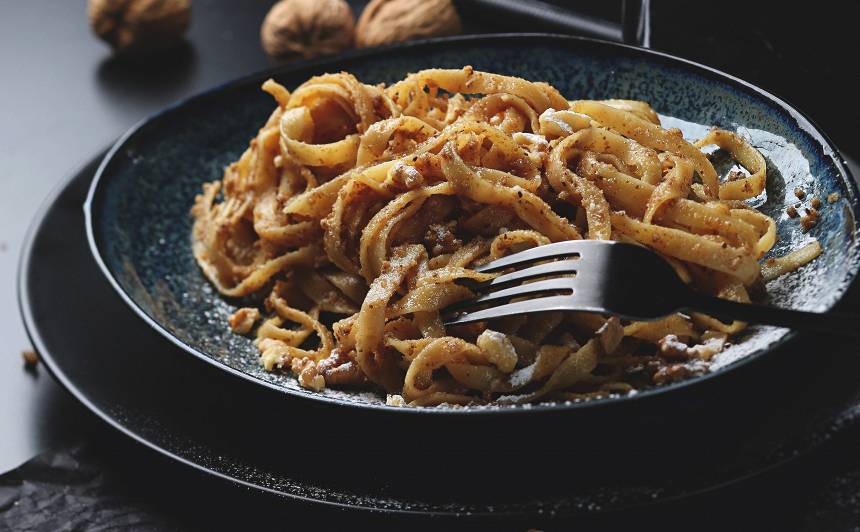 Viss triks slēpjas sviestā. Svarīgi to nevis vienkārši izkausēt, bet nedaudz sabrūnināt, līdz virtuve sāk smaržot pēc grauzdētiem lazdu riekstiem. Tad šajā zeltainajā šķidrumā apviļā karstus makaronus un burtiski noslīcina smalki maltos valriekstos. Šis nav izsmalcināts restorāna deserts, bet gan kaut kas daudz labāks – sildošs, godīgs un neticami sātīgs mierinājums tajās dienās, kad gribas kaut ko garšīgu un tūlīt.