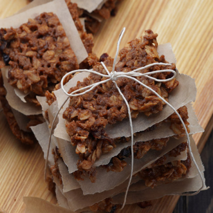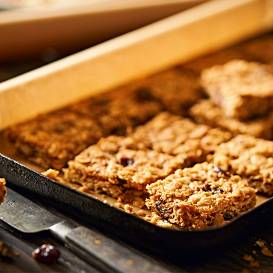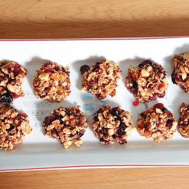 - Ļoti gatavu banānu sašķaida putriņā, pievieno olu, sīrupu, zemesriekstu sviestu, kanēli, sāli, pamatīgi sakuļ, lai labi sajaucas. Iemaisa miltus, auzu pārslas, sakapātus riekstus, sēklas un dzērvenes vai rozīnes.
