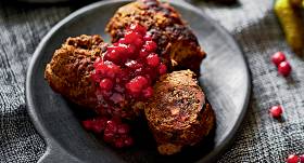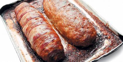 - Sagatavoto, atpūtināto gaļas masu saplacina pāris centimetru biezā iegarenā plācenī, tam pa vidu visā garumā kārto ceptos ķirbjus un sēnes, pārber brūklenes, pārkaisa timiānu.