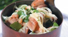 - Dziļā pannā uzkarsē eļļu, tajā liek sagriezto fileju, ātri apmaisa, lai karstumā apraujas un liek klāt sagrieztos dārzeņus.