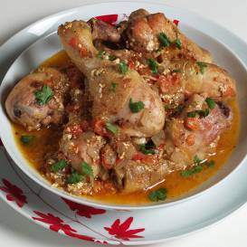 - Sajauc marinādes sastāvdaļas, ar tām ieberzē vistas gabalus un uz 30 minūtēm vai ilgāk noliek iemarinēties.