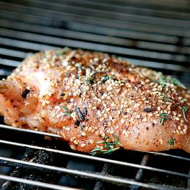 Vistu no abām pusēm grilē, līdz temperatūra filejā sasniegusi 70 grādus un, iedurot mīkstumā, sūcas dzidra sula.