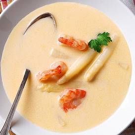 - Kamēr zupa vārās, greznojumam atliktās sparģeļu galotnītes uz brīdi pārlej ar verdošu ūdeni, tad pārgriež un sajauc ar pārējām sastāvdaļām.
