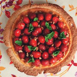- 5 glāžu tilpuma kupolveida bļodu rūpīgi izklāj ar pārtikas plēvi, cieši piespiežot un izlīdzinot, lai starp plēvi un bļodu nepaliek gaisa burbuļi. Plēves malām ļauj nokarāties gar bļodas malu. Zemenes sagriež ripiņās, galus neizmantojot, un, sākot no bļodas dibena, visu līdz pat bļodas augšai izklāj ar tām. Kamēr dara pārējo, bļodu liek aukstumā.