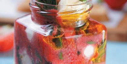 - Stikla traukā pamīšus kārtām liek zemeņu šķēlītes, mocarellas gabalus un bazilika lapiņas.