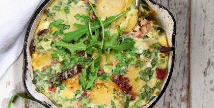 Paprikas, tumšo lapu kāpostu un zilā siera fritata