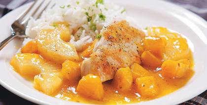 - To vietā apcep 1 ēdamkaroti miltu un kariju, iemaisa 1 glāzi ūdens, pievieno saldo krējumu, nedaudz pavāra, pievieno citrona sulu, pēc garšas sāli, cukuru, piparus, pārlej filejām un augļiem.