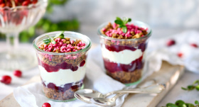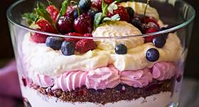- Pārbārsta ar pralinē, ko pagatavo, drumstalās sablendējot karamelizētus riekstus. Kūku uz pāris stundām liek ledusskapī.