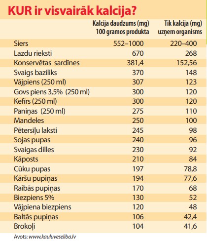 Atbild endokrinologs profesors Aivars Lejnieks: «Tas atkarīgs no mūsu ēdienkartes – kalcijs būtībā ir gandrīz visos, īpaši piena, produktos. Taču ar uzturu vien nepieciešamo dienas devu, kas vidēji (19–50 gadu vecumā) ir 1000 mg kalcija dienā, grūti uzņemt. Tāpēc šad un tad kādu kalcija preparātu var nopirkt un palietot, piemēram, vienu vai divas 500 mg tabletes dienā, pārējo kalcija daudzumu uzņemot ar sieru, biezpienu, pienu un citiem produktiem. Pārdozēt arī nevajag, jo kalcijs ir viens no unikāliem elementiem mūsu organismā – tā nedrīkst trūkt un tas nedrīkst arī būt par daudz.
