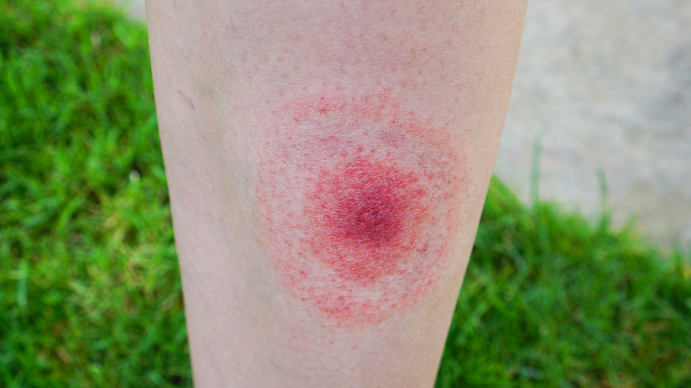 - Apaļš ādas apsārtums. Visbiežāk – plankums ar bālāku vidu un sarkanu actiņu. Parasti parādās ērces piesūkšanās vietā pēc 1–2 (maksimāli – 4) nedēļām, izplatās 3–5 cm diametrā (un vairāk) un pēc laika pakāpeniski pazūd. Bet tas ir tikai apmēram pusei un var būt arī citādāks!
