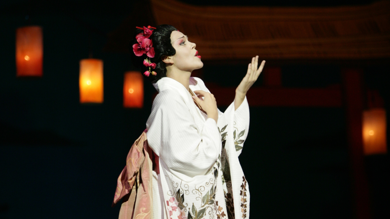 Džakomo Pučīni opera vēstī par japāņu meitenes nelaimīgo mīlestību pret amerikāņu virsnieku. 1925. gada uzvedumu veidoja diriģents Jānis Mediņš kopā ar režisori Sofiju Maslovsku, kā arī dekorāciju un kostīmu mākslinieku Eduardu Vītolu. 21. gadsimtā nesenāko šī iestudējuma atjaunojumu veidoja režisors Vladimirs Okuņs, scenogrāfs Juris Salmanis un kostīmu māksliniece Kristīne Pasternaka.