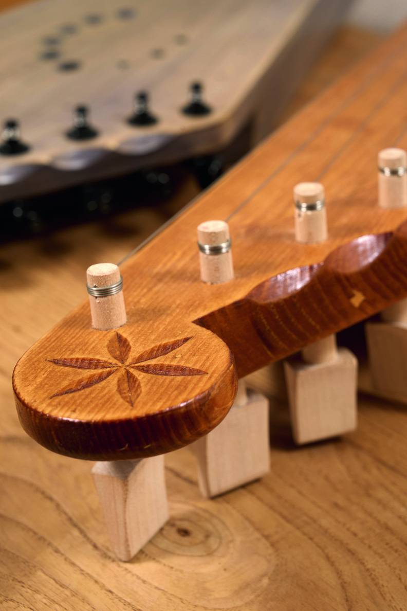 «Etnogrāfiskajām koklēm ir bijušas koka tapiņas,» stāsta Kārlis. «No koka ir arī atslēdziņa, ar kuru, pagriežot tapiņas, stīgas var palaist vaļīgāk vai pievilkt stingrāk un uzskaņot kokli. Tapiņām vajadzīgs cietāks koks nekā pašai koklei – osis, kļava, daudz izmantoju arī mūsu pašu dārza ābeli, kas izkalst gandrīz tik cieta kā akmens. Citi izmanto pat ozolu. Man patīk viendabīgāka struktūra, kā, piemēram, kļavai, kur nav cietu izteiktu šķiedru un mīksto daļu. Osim un ozolam struktūra ir ļoti neviendabīga. Lai gan tas nav tik viegli izdarāms, pieaudzis cilvēks lēnā garā var tapiņas pagrozīt. Taču kokles spēlē arī ļoti daudz bērnu, un viņiem tapiņu grozīšana ir pārāk grūts uzdevums. Turklāt mitrumā piebriedušās koka tapiņas mēdz iesprūst un tiešām nav vairs izkustināmas. Ja tām ķeras klāt ar spēku, tapiņas nolūst un jānes pie meistara dakterēt. Lai gan atspriegošanai pietiktu ar nelielu viltību – tapiņas ir konusa formas ar resnāko galu apakšā – pietiktu nedaudz uzsist no augšas, un iesprūdusī tapiņa kļūtu vaļīgāka.