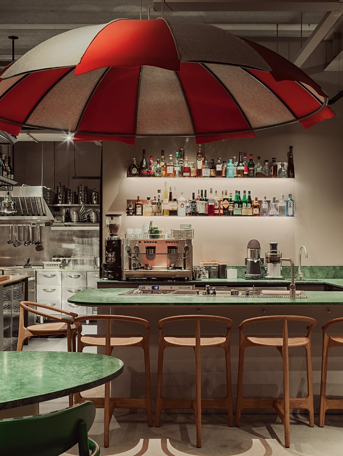 Izteiksmīgi interjera elementi, ko īpaši novērtē un pamana restorāna viesi, ir milzu saulessargi, kas kalpo gan kā gaismekļi, gan kā akustiski risinājumi, lai klusinātu telpu, mazinātu atbalsi un piešķirtu mājīgāku atmosfēru. Un, protams, tie kalpo arī kā atsauce uz saulainām dienvidu pludmalēm. Viens saulessargs izkārtots virs bāra zonas, pārējie – virs lielajiem saimes galdiem, kas paredzēti ģimeniskākai restorāna pieredzei. Tajos iestrādātas arī dažādas gaismas funkcijas, kas var mainīt telpas atmosfēru trijos dažādos režīmos – dienas, vakara un nakts.