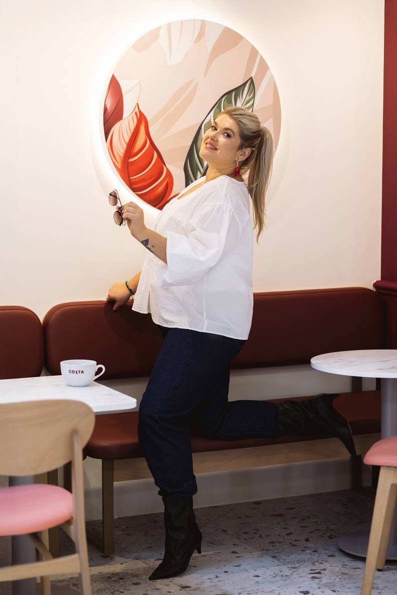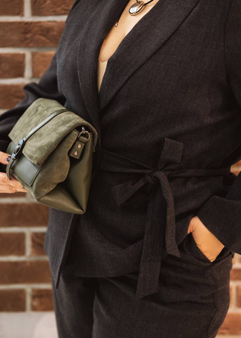 Žaketei iestrādātā josta sākotnēji var šķist neierasts vai pat lieks elements, taču vieglais audums un smalkā josta lieliski, bet delikāti izceļ modeles vidukli, piešķirot siluetam izsmalcinātu formu. V veida izgriezumu papildina rotaslietas – ādas saitē ievērtā kulona smalkā līnija vizuāli pagarina siluetu un izceļ vertikāli, savukārt izteiksmīgie lāses formas auskari piešķir koptēlam fifīgu un sievišķīgu noskaņu.