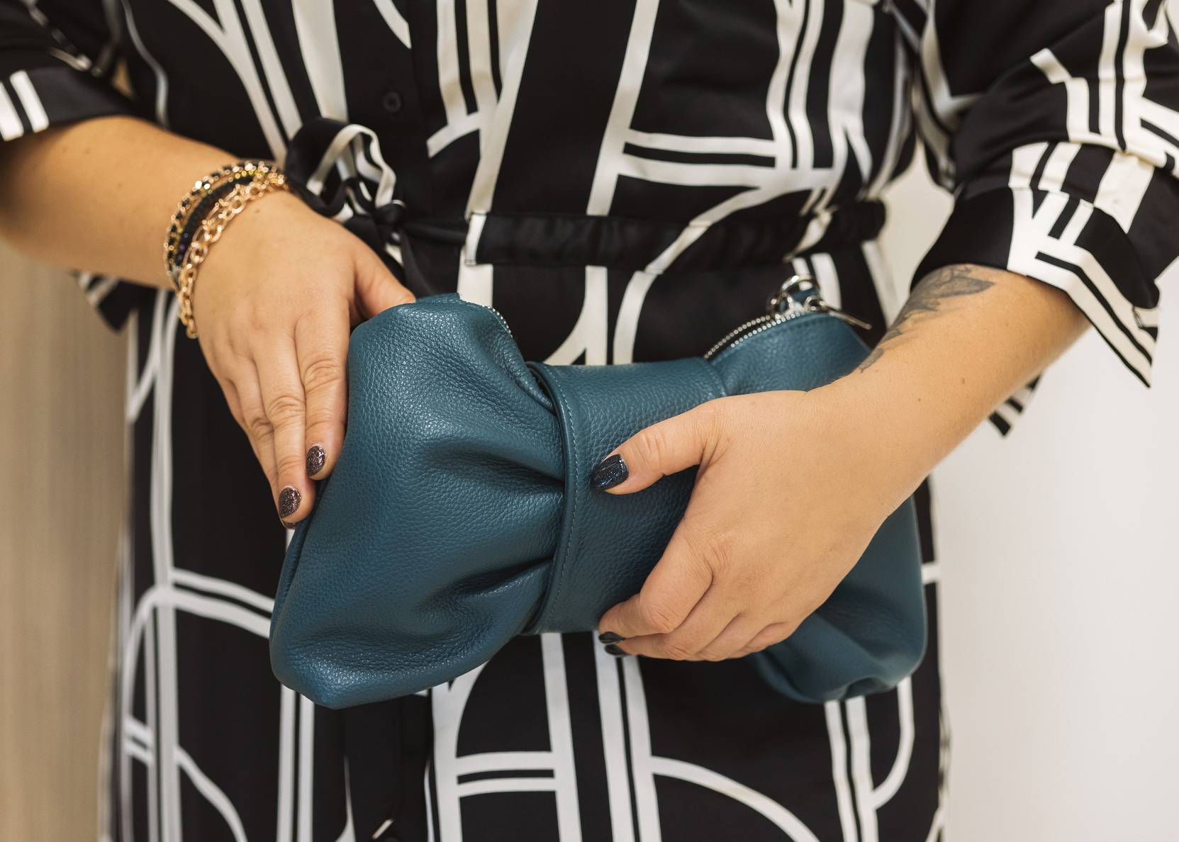 Rokassoma aktuālajā zaļajā tonī, ar noapaļotām formām līdzsvaro kleitas ģeometriskās līnijas. Koķeta un romantiska noskaņa koptēlu padara vēl interesantāku. Ņem vērā, ka arī somas izmēram jābūt saskaņotam ar valkātājas auguma kopējām proporcijām. Tāpat kā ar apdrukām apģērbā – jo smalkāks augums, jo smalkāka somiņa, un otrādi.
