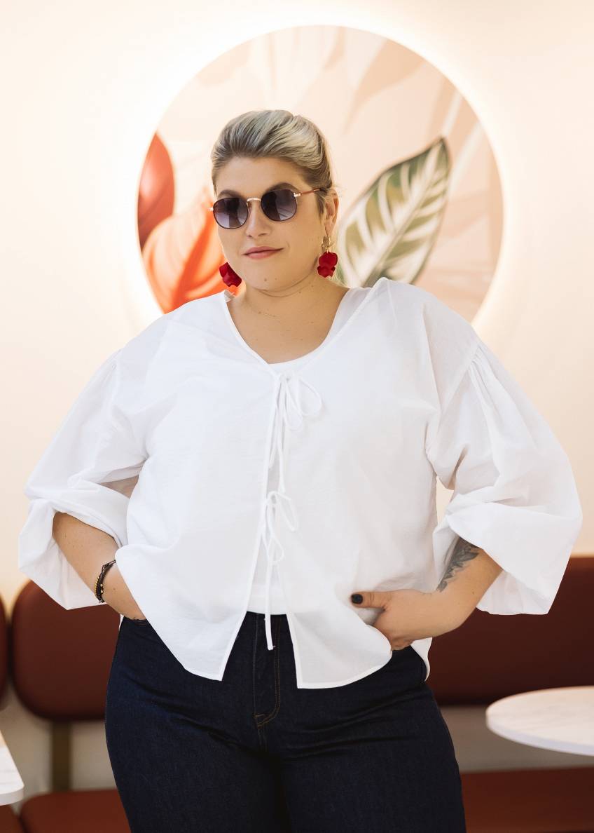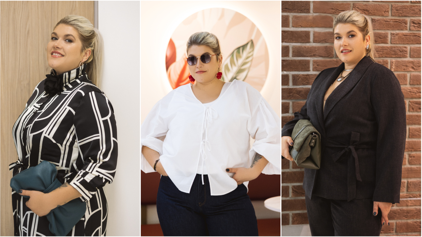 Balts krekls ir mūžīga klasika, taču sievietēm ar pilnīgākām formām nav jāaprobežojas tikai ar tradicionālo pogu rindu. Lielisku alternatīvu piedāvā modeļi ar dekoratīvām saitītēm, kas piešķir tēlam vieglumu un personību. Kombinācijā ar vienkāršu trikotāžas topiņu zem krekla, iespējams veidot interesantus slāņus un piešķirt koptēlam raksturu. Šāds risinājums lieliski atsvaidzina ziemeļnieciski atturīgo stilu, piešķirot tam rotaļīgumu. Un, protams, akcentēti auskari košā un izteiksmīgā tonī, kombinācijā ar saulesbrillēm veido pārdomātu aksesuāru tandēmu.