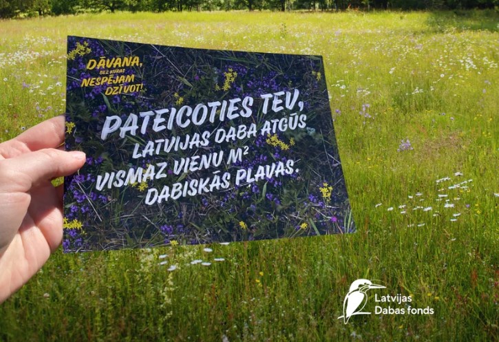 Par katru ziedojumu Latvijas Dabas fonds nodrošinās 1 kvadrātmetra dabiskās pļavas atjaunošanu aizsargājamā ainavu apvidus Ziemeļgauja zemes īpašumā Lejzemnieki, kur tiek atjaunota 19 ha plaša parkveida pļava. Par saziedotajiem līdzekļiem tiks iegādātas pļavas augu sēklas, veikta augsnes sagatavošana, sēklu iesēšana (roku darbs), apsaimniekošana. Komplektā ietilpst aploksne un kartīte (21 × 14,8 cm). Svarīgi! Ziedojot netiek iegādātas īpašuma tiesības.