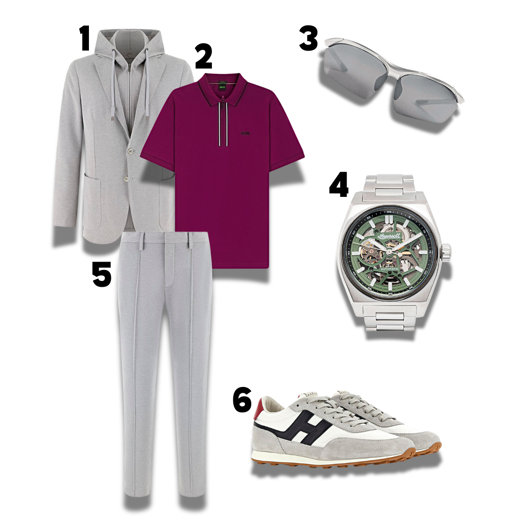 Alternatīva klasiskam bleizeram – komfortabla sportiska stila žakete ar kapuci, kuru valkāt kopā ar tāda paša elastīga auduma biksēm, sportiskiem apaviem un saulesbrillēm. Neitrālas krāsas bikses var kombinēt ar kontrastkrāsas polokreklu.