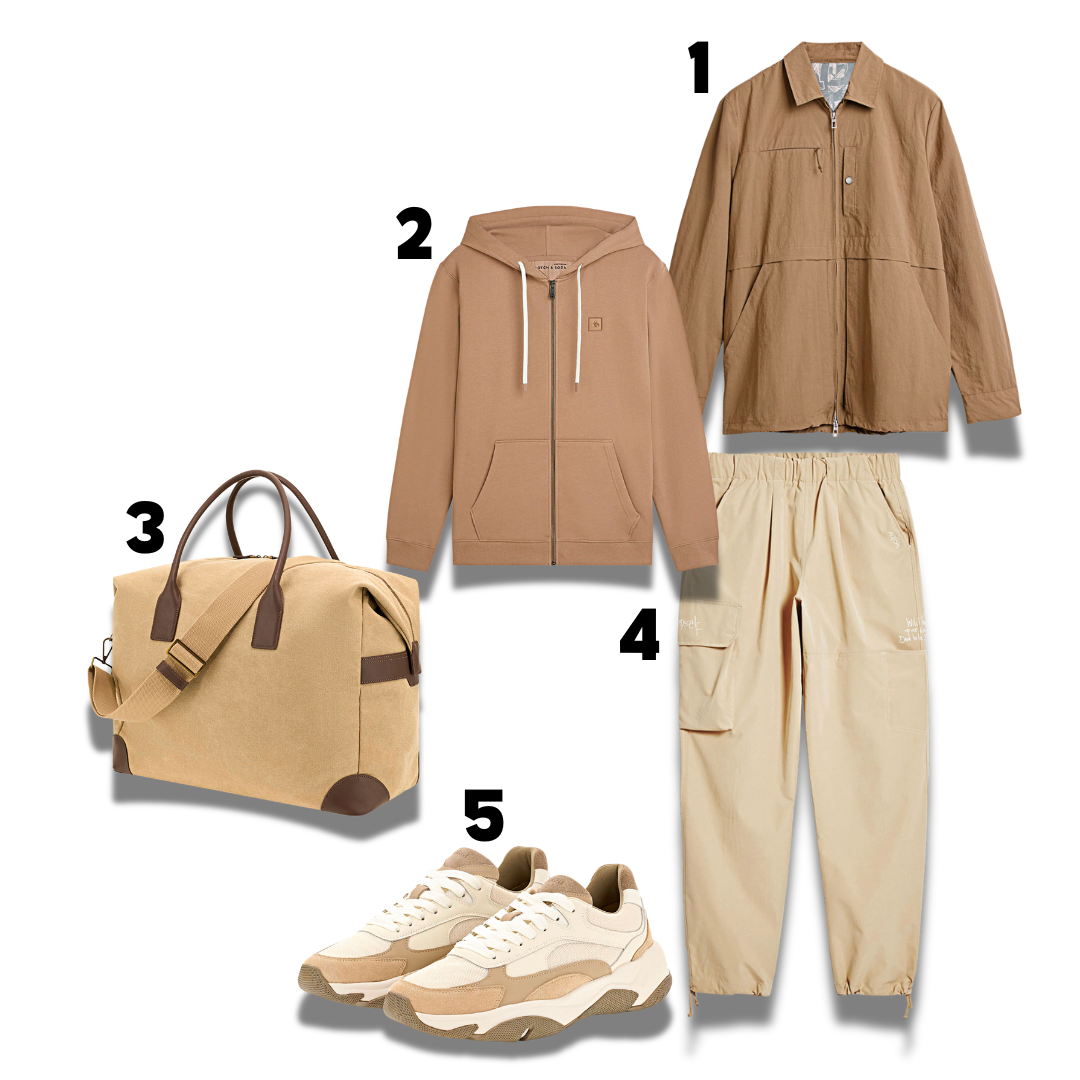 Universāls komplekts gan ikdienai, gan ceļojumiem – brīva piegriezuma viegla vēja un lietus necaurlaidīga jaka, ērts hūdijs, paplatinātas cargo stila bikses ar lielām sānu kabatām un ietilpīga soma.
