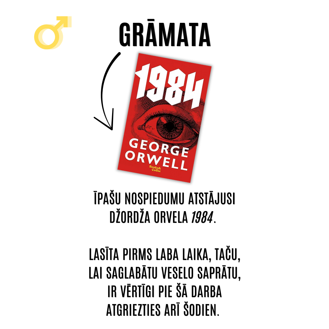 Īpašu nospiedumu atstājusi Džordža Orvela 1984. Grāmatai drīz būs gadsimts, un nav šaubu – autors neskatījās nākotnē, pareģojot notikumus, bet gan dziļi cilvēka dabā un rīcībā. Lasīta pirms laba laika, taču, lai saglabātu veselo saprātu, ir vērtīgi pie šā darba atgriezties arī šodien. Tas palīdz izskaidrot dažādas mūsdienu parādības un varas mehānismus.