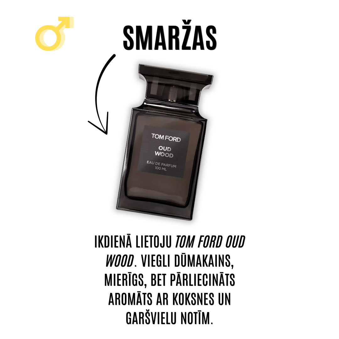 Ikdienā lietoju Tom Ford Oud Wood. Viegli dūmakains, mierīgs, bet pārliecināts aromāts ar koksnes un garšvielu notīm. Šā paša dizainera repertuārā netrūkst arī smaržu variantu saviesīgiem vakariem vai vieglākām noskaņām.