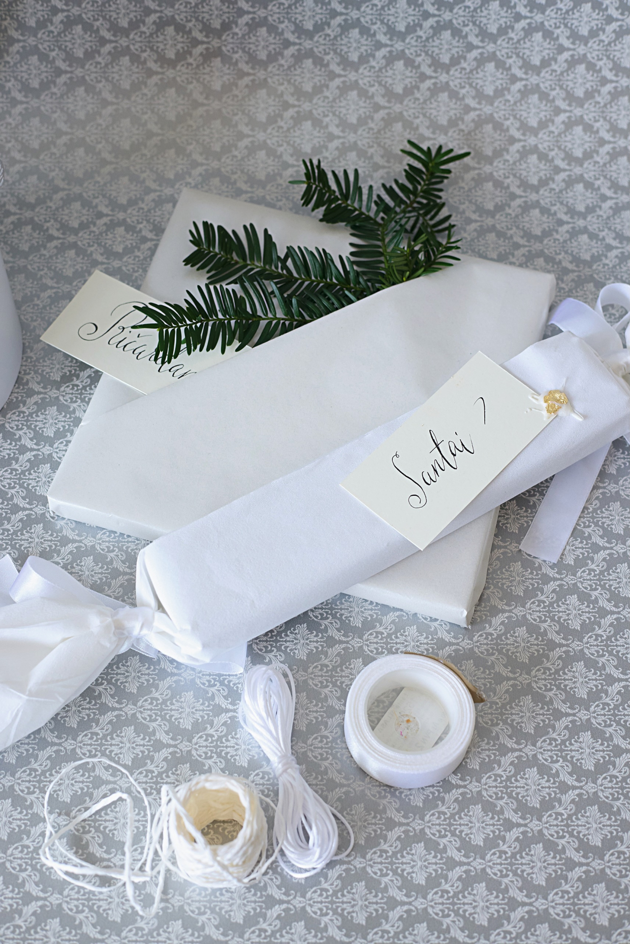 Ja gribi iesaiņot kā konfekti, izmanto kreppapīru – tas nelūzīs, neplīsīs, būs viegli sasienams. Savukārt vārda kartīti pielīmē ar zīmoglaku.