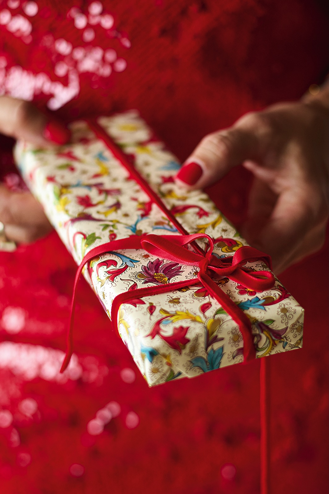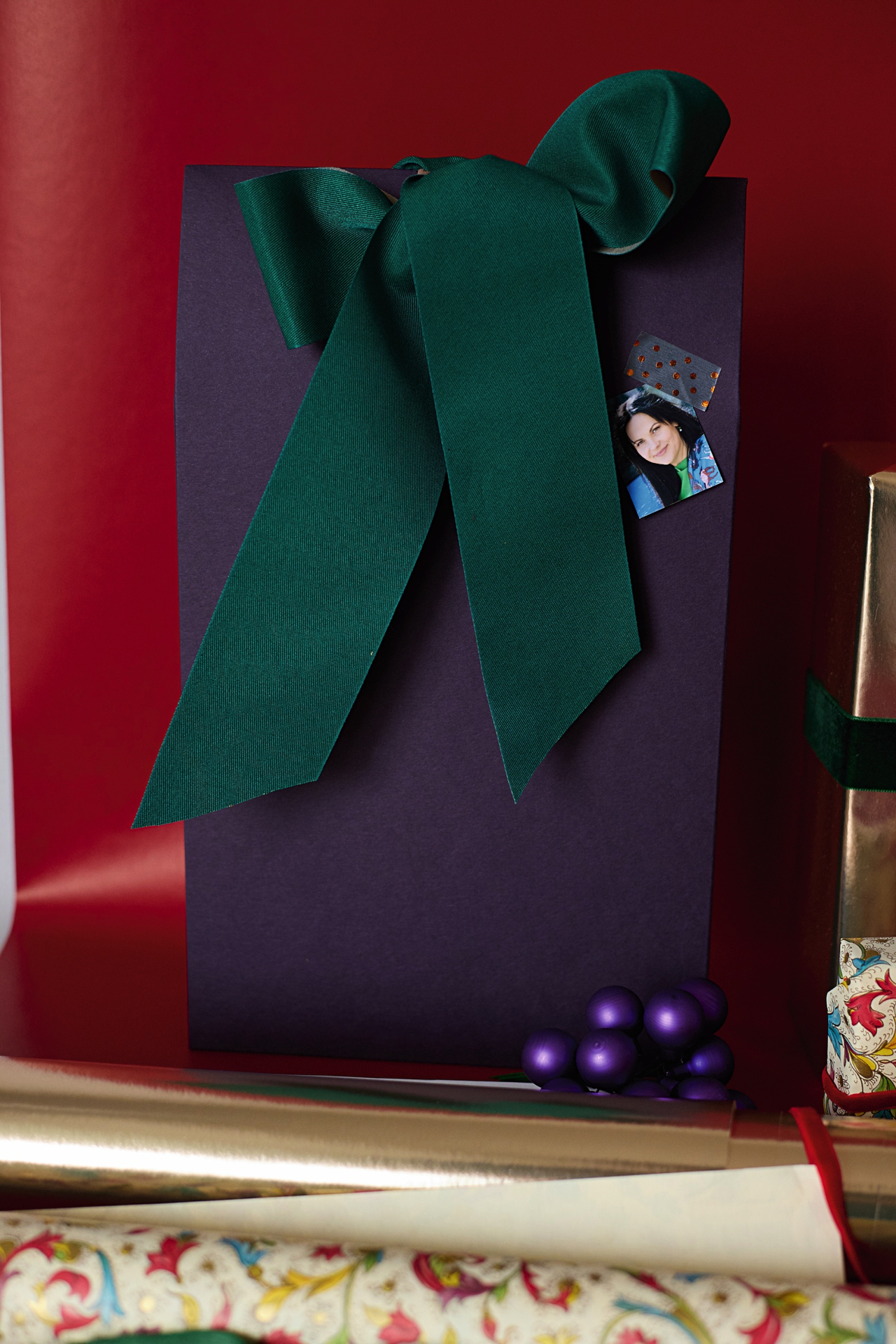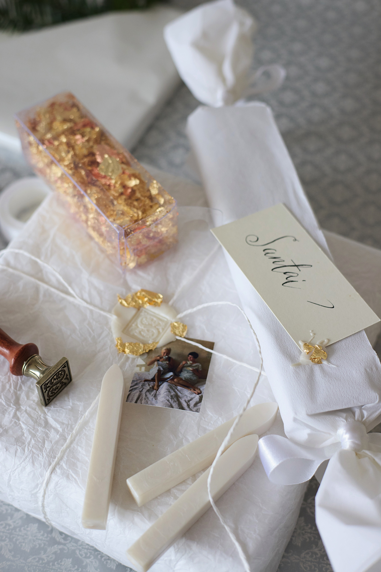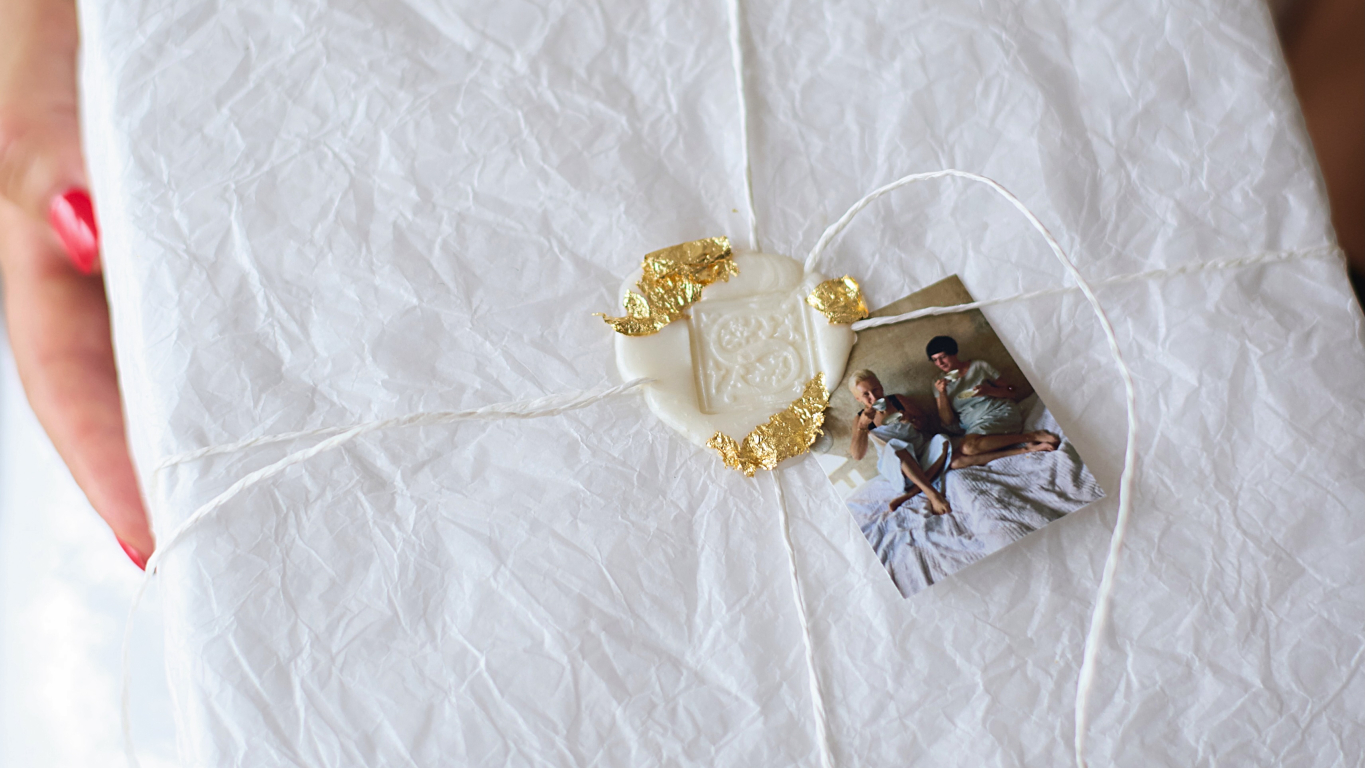 Pirms saiņo zīdpapīrā, saburzi to, būs vieglāk iesaiņot, un izskatīsies efektīgāk. Ja negribi, lai spīd cauri, liec 3–4 kārtās. Savukārt uz zīmoglakas uzspied sava vārda pirmo burtu, bet vārda kartītes vietā pieliec foto, kur esi kopā ar apdāvināmo.