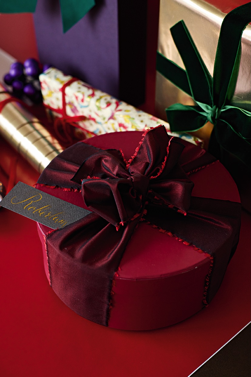 Krāsaina kaste, kuru pietiek apsiet ar efektīgu lenti. Šī ir plēsta tafta lente – tafts ir viens no audumiem, kas viegli plīst un izskatās grezni.