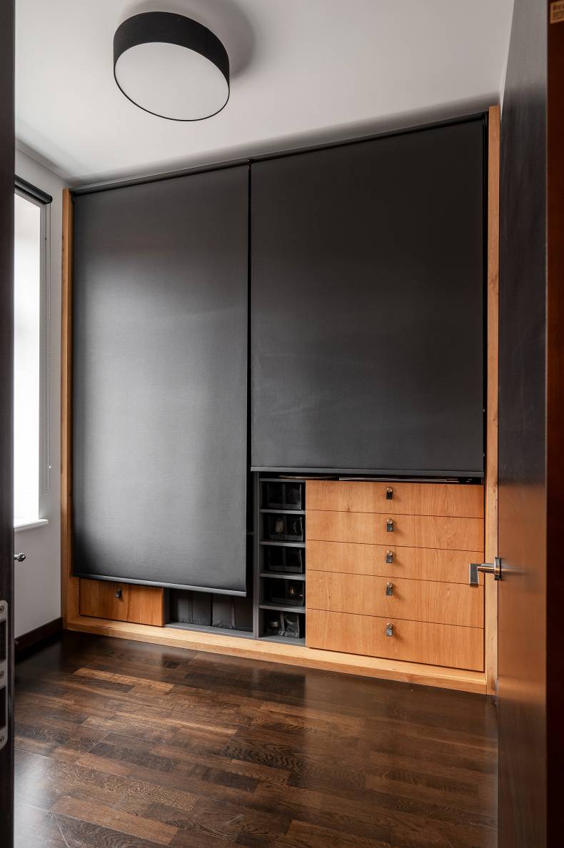 Dzīvokļa plānojuma veiksme ir ērtie funkcionālie risinājumi, arī garderobe, kurā plaukti aizsegti nevis ar bīdāmām durvīm, bet rullo žalūzijām.