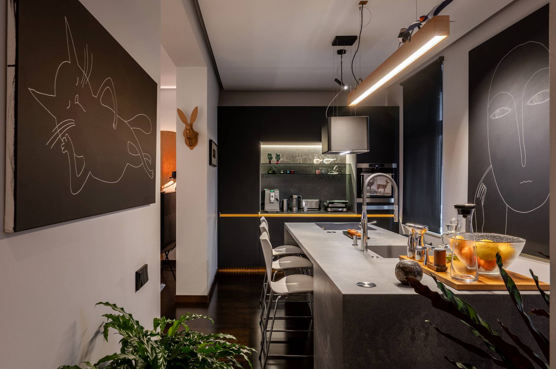 Virtuvi pēc saimnieces vīzijas uzzīmēja arhitekte Rita Laudere. Tās salā integrēta plīts, izlietne un trauku mašīna, no vienas puses tajā ir skapīši un atvilktnes, no otras – var apsēsties kā pie bāra letes.