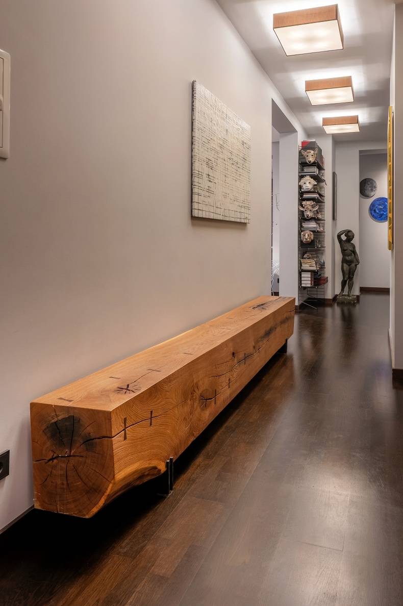 Par veiksmi saimnieki uzskata satikšanos ar brīnišķīgu galdnieku Verneru Kalāci, kas izgatavoja virtuves mēbeles, gultu un galdu. Priekšnamā Andris vēlējās solu, un meistars to piedāvāja veidot no bluķa. «Verners atrada 600 kilogramu smagu ozolkoka masīvu, pilnu ar šķembām, jo tas nācis no Kurzemes katla,» atceras saimnieks. «Bluķi pieci vīri lāgā nevarēja pacelt, vēl grūtāk bija to kāpņu telpā izgrozīt, tāpēc tagad tas te novietots uz mūžu.» Savukārt vannasistabai galdnieks izgatavoja lielu, melni krāsotu bluķi ar skapīša funkciju. Tam ir iestrādāti ritentiņi, tāpēc pa telpu to var pārvietot.