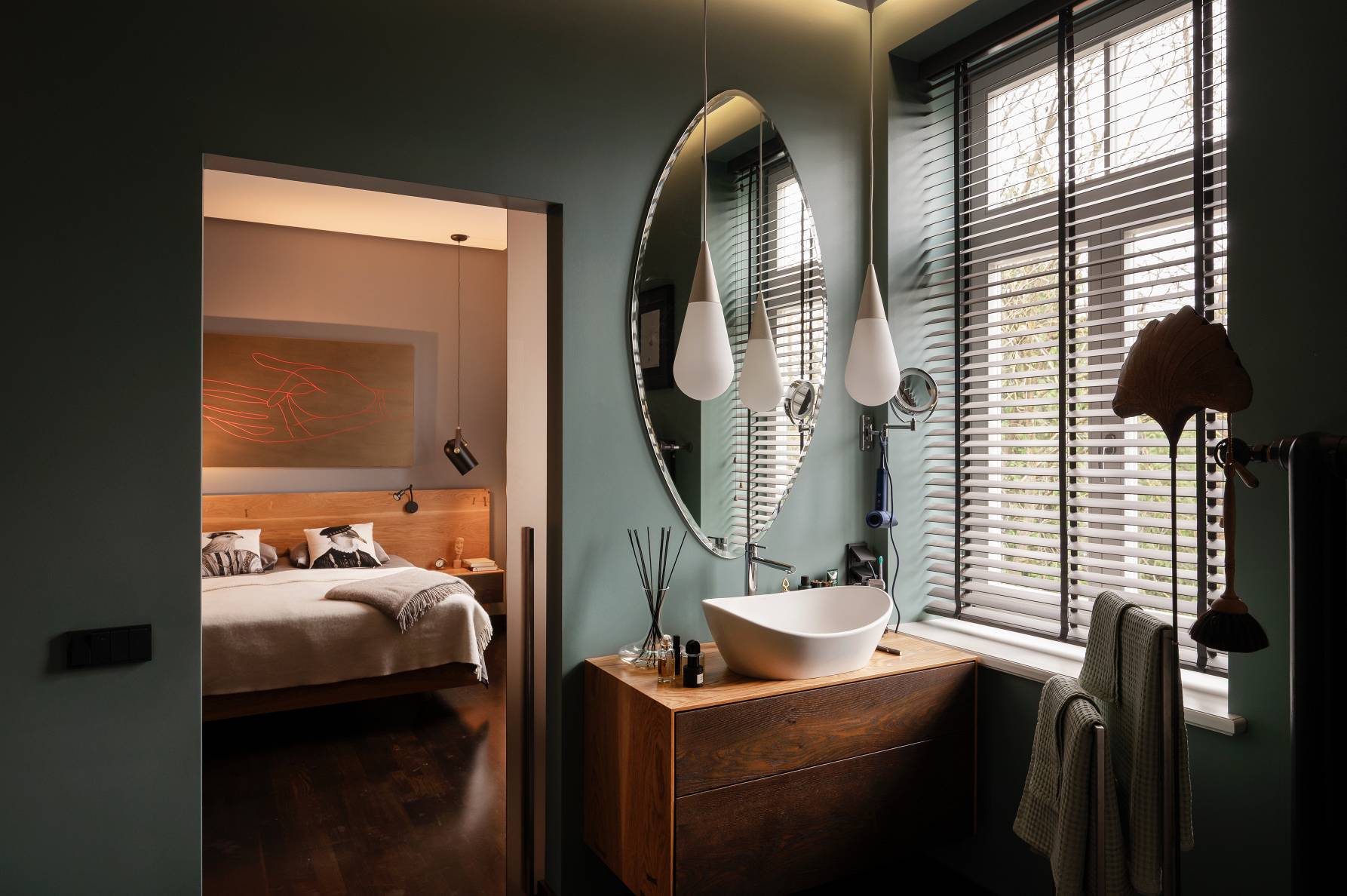 Pie guļamistabas izveidota plaša vannasistaba ar lielu, ovālu spoguli un seniem, atjaunotiem čuguna radiatoriem.