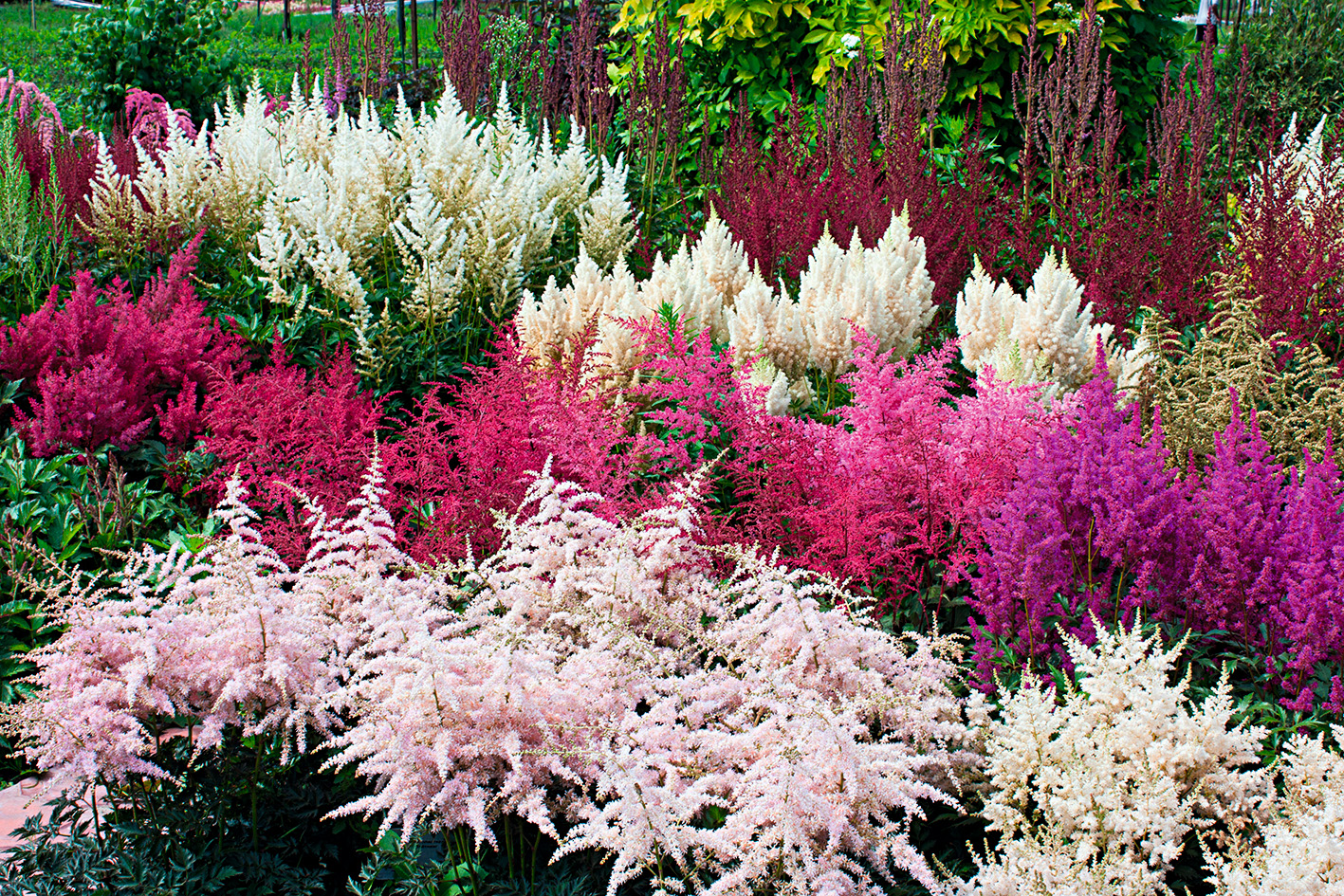 - Astilbes (Astilbe) – liela šķirņu, augumu un krāsu dažādība. Pirmās sāk ziedēt jau jūnijā, un pēdējās beidz ziedēt septembrī. Lapas arī pēc noziedēšanas ir pietiekami dekoratīvas, turklāt lapojums ir ne tikai zaļā, bet arī citos toņos – no sudrabaini zaļa līdz purpura melnam. Piemērotas gan saulainai vietai, gan arī nelielam noēnojumam. Mīnuss – mēdz būt melnās laputis.