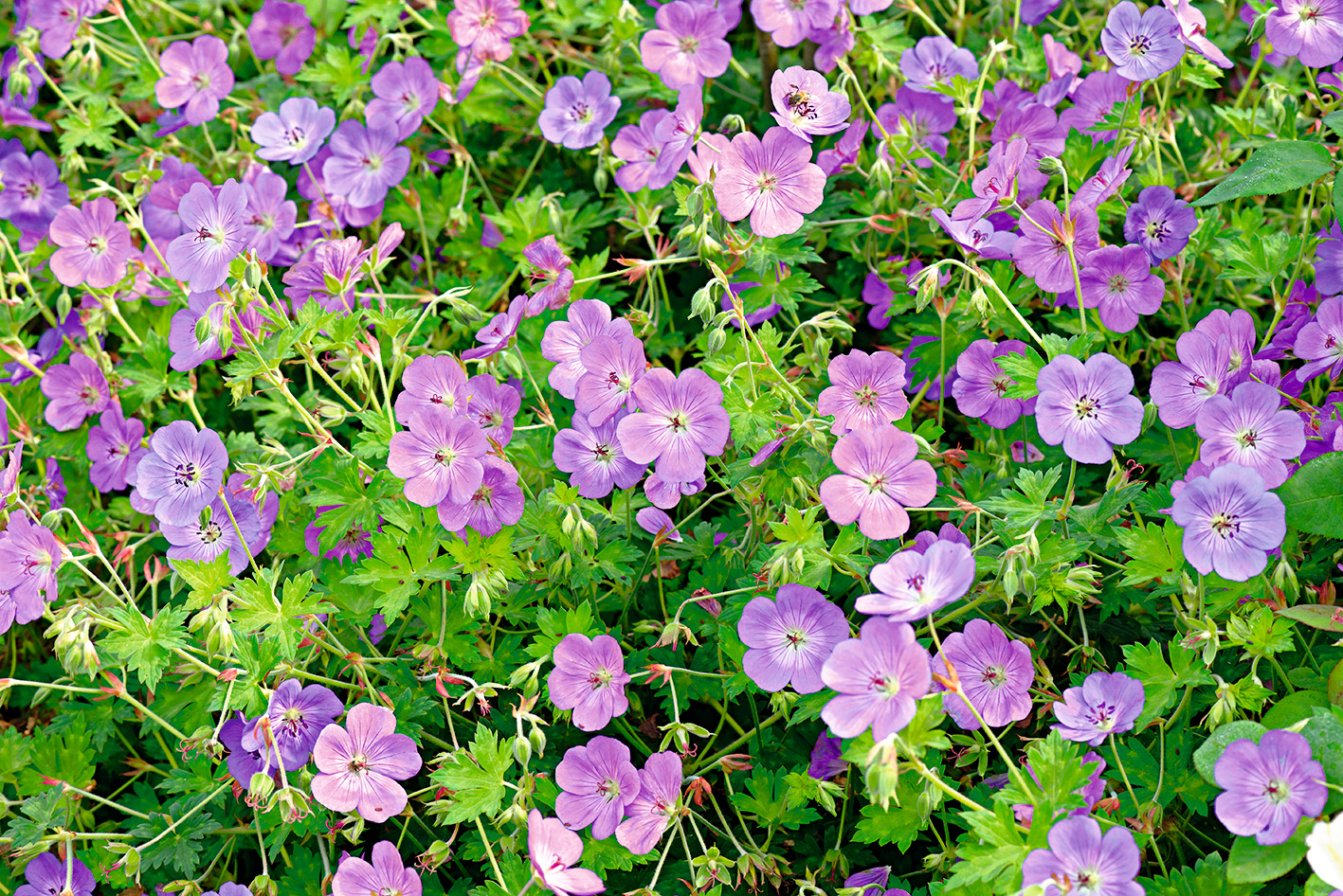 Foto: mcajan / Shutterstock - Gandrene (Geranium) ‘Rozanne’ zied visu vasaru – no jūnija līdz septembrim. Augstums 40–45 cm, violetzili ziedi. Visas gandrenes nav īsti labas, jo tām pazūd lapas, taču šī šķirne derēs viegli kopjamam dārzam.