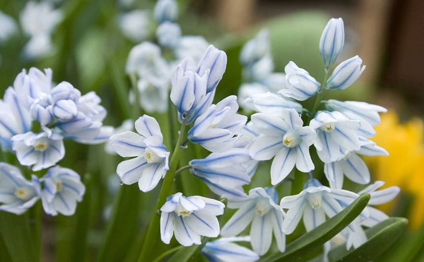 - Zemas pavasara sīpolpuķes ar baltiem vai īpatnēji krāsotiem ziediem – gaišzili ar tumšāk zilu svītrojumu.