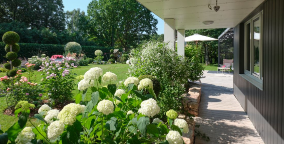 Dace: «Sākumā plānojām – būs tikai pļavas strēmele, kultivētas puķes, zāliens un vairāk nekā. Bet, skatoties pa virtuves logu, secināju – pietrūkst ainavas. Lēmām, ka jāizveido tāds kā parks. Draugi iepazīstināja ar dārzu un senu parku speciālisti Ilzi Janeli, viņa atbrauca un izplānoja. Nu mums ir 38 dažādu sugu koki un krūmi, tie jau ir pilnbriedā.»