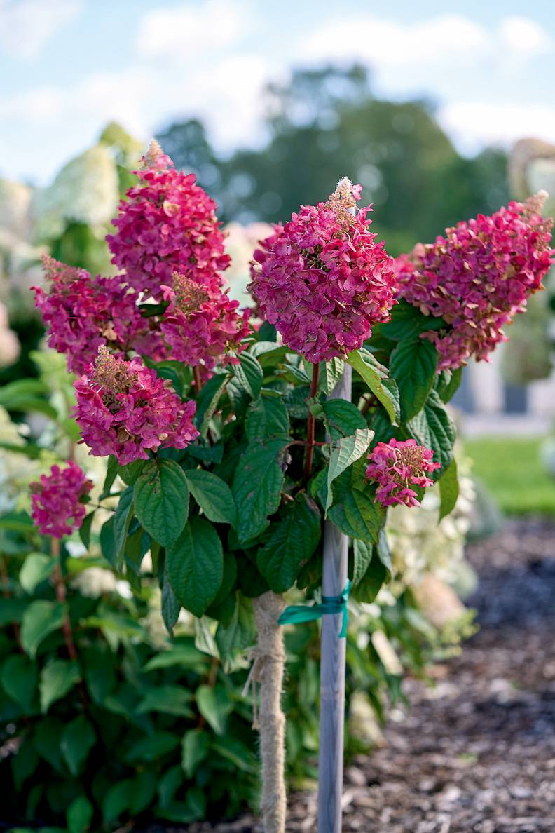 Foto: Gvido Kajons‘Diamant Rouge’ (‘Rendla’). - ‘Early Harry’. Lai gan ziedi nav milzīgi, toties šķirne ir gana agra, koša un glīta. Ziedēšanas sākumā ziedkopa baltas krēmkrāsas, ar laiku kļūst rozīgi violeta. Skaisti kontrastē palieli sterilie un smalkie fertilie ziediņi. Kompaktais krūms var izaugt 1,5 m augsts. Arī izturīgie, staltie dzinumi atspīd violetā tonī.