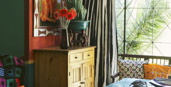 Lai brīvdienu mājas interjers iegūtu gaumīgu balansu, tajā nepieciešams vismaz viens, kaut neliels, rotaļīgs pretstats kopējam stilam. Arī klasiskā ņujorkieša lauku īpašumā redzēsiet izteiktas glamūra iezīmes – uzkrītošas detaļas, kas kontrastē ar dabas materiāliem un liek ienācējam piesiet aci.