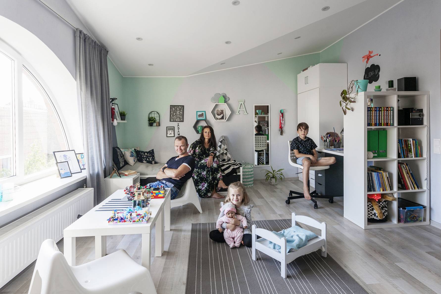 Daudzdzīvokļu nams Upes ielā, kurā dzīvo Lejiņu ģimene – Ieva, Dzintars, Anna un Ādams –, būvēts 90. gadu sākumā. To projektējis Ievas tētis un par projektēšanas darbu viņam šeit piešķirts viens no plašākajiem dzīvokļiem divos stāvos. «Māju būvēja rekordātrumā, tāpēc šeit viss ir šķībs un greizs, neviens stūris nav taisns,» stāsta Ieva.