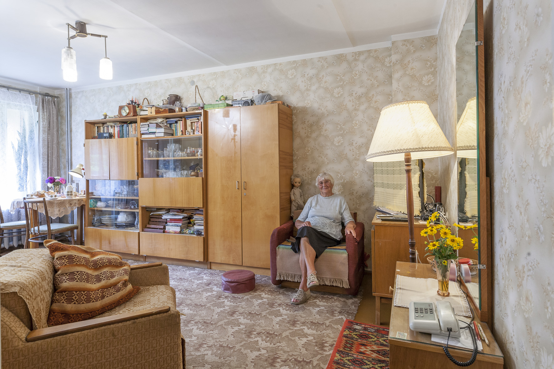 Bet izvelkamo klubkrēslu man izgādāja cita draudzene no Talsiem.» Vaicāta par māju sajūtu, Ernas kundze pārlaiž skatu istabai un nosaka: «Man nekā netrūkst. Mājās viss ir tā, kā vajag.» Un tik tiešām, jo sekcijas bāriņā vēl aizstāvējies neatvērts Melnais balzams no astoņdesmitajiem.