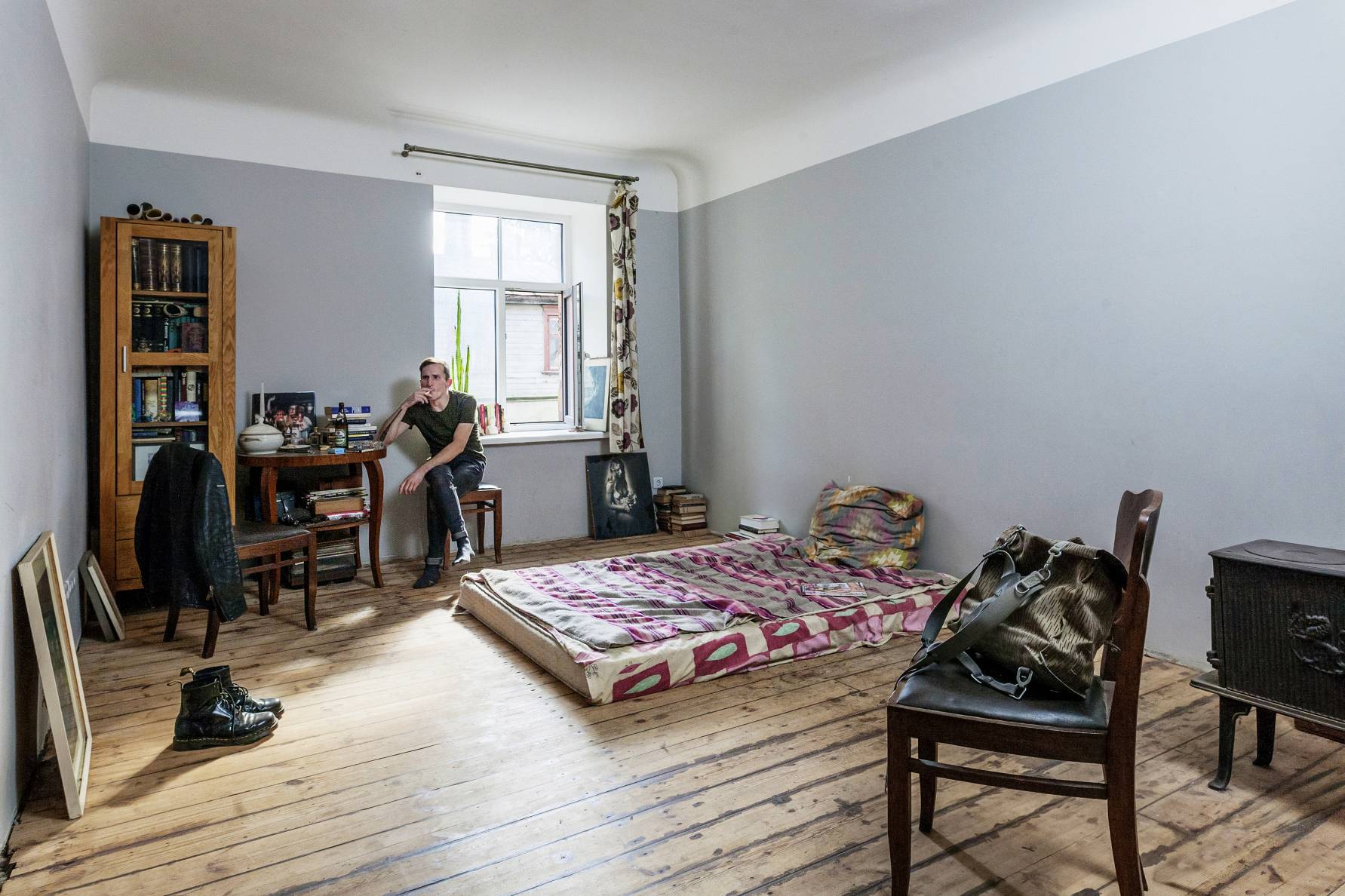 Šķiet, Krāsotāju un Lienes ielas rajonu Rīgā joprojām droši var dēvēt par geto. No vārtrūmes, kas atrodas līdzās Kārļa Krauļa dzīvesvietai iekšā un ārā staigā treniņtērpos tērpušies čigāni. Kārlis dzīvo viens ar kaķi, kura vārds ir Kaķis. Lai gan divistabu dzīvoklis ir veidots tā, lai tajā būtu forši dzīvot, šobrīd, līdz ar darba maiņu, Kārlis dzīvoklī galvenokārt tikai nakšņo, bet pārējo laiku pavada darbā – bārā Chomsky. «Kad atnāku mājās, uzpīpēju, pakasu pakausi un dodos pie miera.» To apliecina arī fakts, ka mājoklī nav elektrības. «Tā ir pārvērtēta,» smejoties saka saimnieks. Kad ziemā, pārnākot mājās, ir galīgi tumšs, Kārlis iededz sveci, bet, ja ir baigi auksts un mājās ir briketes, iekur arī krāsni. Varētu teikt, ka Kārlis dzīvo pašpietiekami. Uz zemes matracis, pie tā grāmatu un žurnālu kaudzes, uz galda pelnu trauks un vēl grāmatas, pie galda divi nosacīta Art Deco stila krēsli no trīsdesmitajiem. Līdzās galdam grāmatu plaukts, bet virs tā rullīšos satīta krājas plakātu kolekcija. Zem galda jau ilgāku laiku stāv plašu atskaņotājs ar tam uzkrautu vinila kaudzi. Un, ja vien šeit būtu elektrība, atskaņotāja mīkstā un dzīvā skaņa piestāvētu dēļu grīdai, ko Kārlis, būdams arī mēbeļu restaurators, savulaik atjaunojis pats.