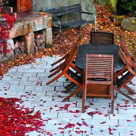 - Metāla kājas parasti dziļi iespiežas zemē, tādēļ zem šīm mēbelēm ieteicams cietais segums – terases dēļi, flīzes, bruģis vai speciālas koka imitācijas dārza flīzes, ko var uzstādīt gan uz betona seguma, gan zālienā.
