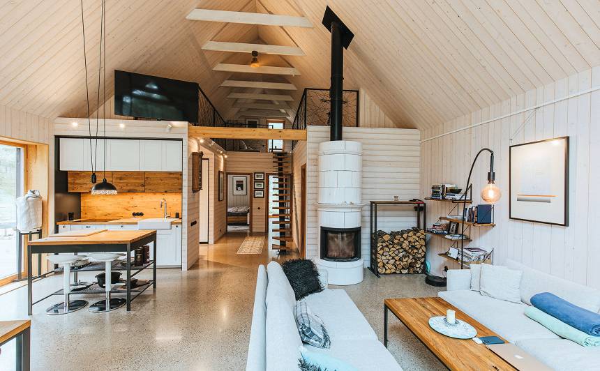 - Tipisks modern rustic – atvērtais plānojums, daudz dabiskās gaismas, kas ieplūst pa lielajiem logiem. Telpas smagsvars – atsegtas robustas koka sijas un kolonnas, kas balsta augstos griestus. Plašo telpu vislabāk zonēt ar lakoniska apgaismojuma un paklāju palīdzību.