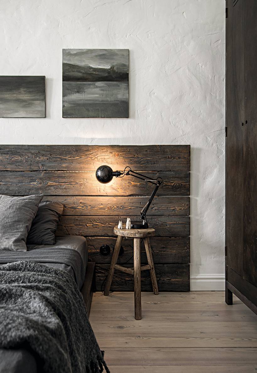 Raupjo dēļu estētika guļamistabai piešķir lauku mājas šarmu. Koka elementi, tāpat kā sienu apdares paņēmiens, demonstrē